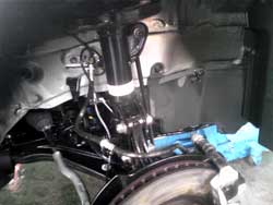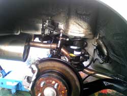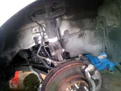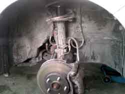 | 後輪の足回り部分やタイヤハウスはもちろん、マフラーまでも凍結防止剤で白く汚れています。放って置くと見えない所がサビだらけに!! | 見てください高圧洗浄機で洗った後はこんなにピカピカ!普段洗わない所もしっかり隅々まで洗い流します!! |