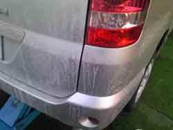 凍結防止剤の付着した下回りやボディーはこのように白く汚れています。
